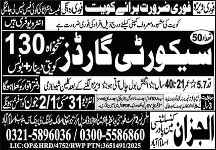 Al Jazan Consultancy Manpower is inviting applications for the position of Security Guard as per the job advertisement published in the daily Express Newspaper on 30 May, 2025 for vacancies in Kuwait.