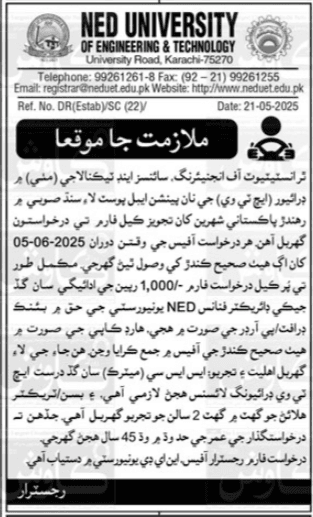 Vacant posts including Driver are announced in Ned University of Engineering & Technology Karachi, Karachi Sindh Pakistan as per 23 May 2025 advertisement in daily Kawish Newspaper. Candidates with Middle, Primary and Matric educational background will be preferred.