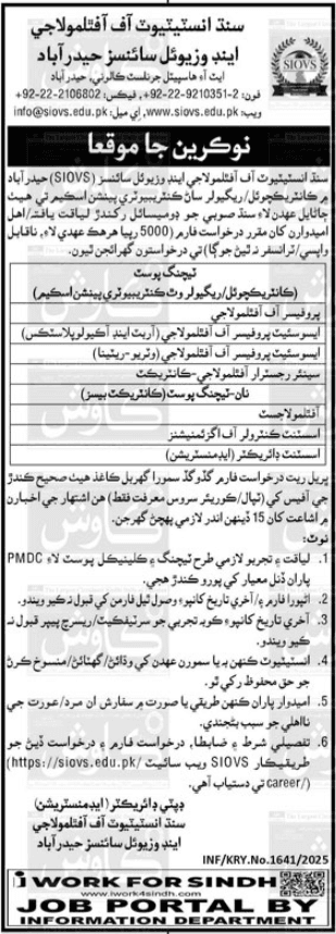 Latest Government jobs in Sindh Institute of Ophthalmology & Visual Sciences SIOVS in Education and others can be applied till 7 June 2025 or as per closing date in newspaper ad. Read complete ad online to know how to apply on latest Sindh Institute of Ophthalmology & Visual Sciences SIOVS job opportunities.