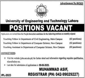 Latest University of Engineering and Technology UET Education Posts Lahore 2025
