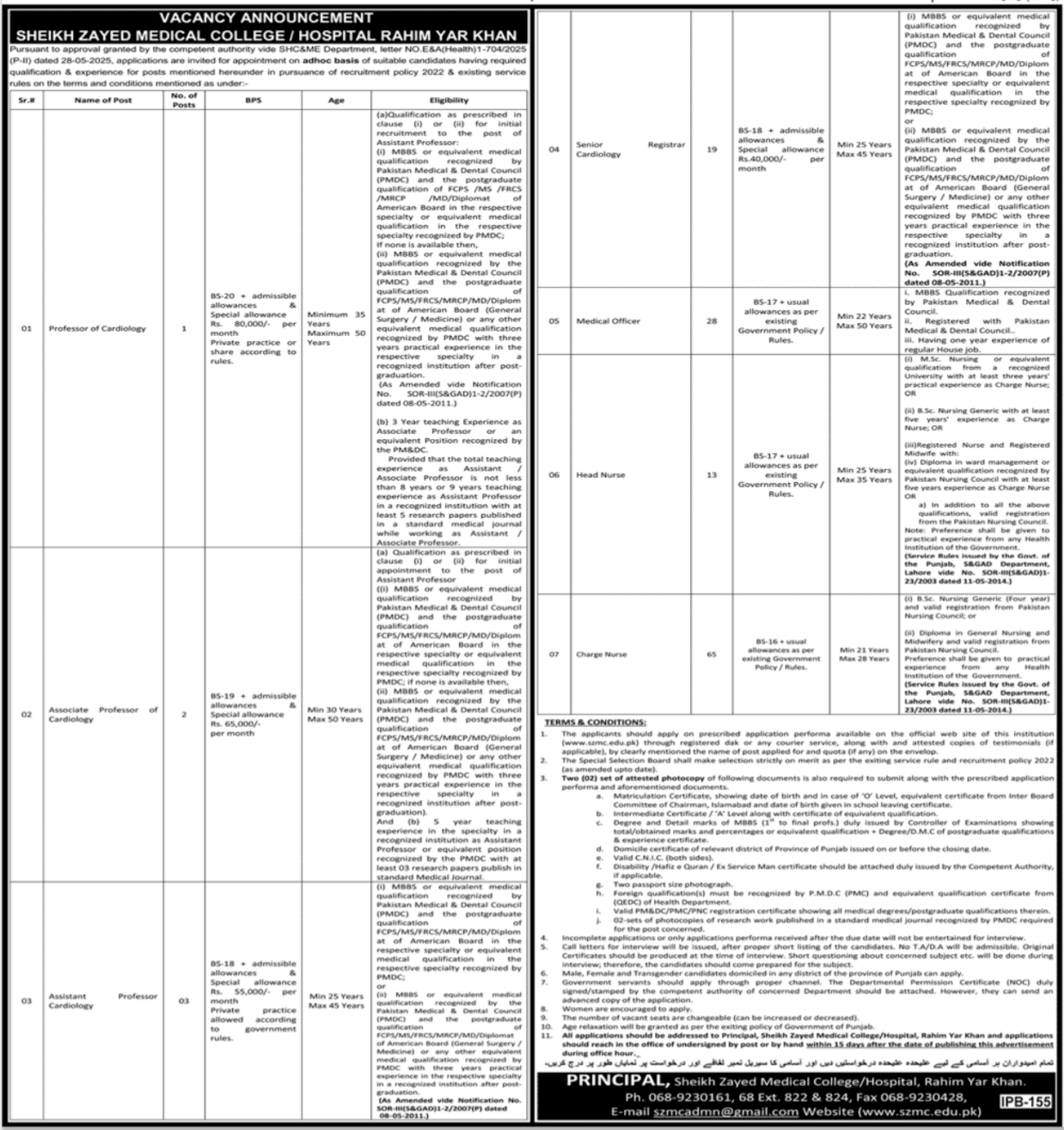 Sheikh Zayed Medical College is inviting applications for the following positions, as per the job advertisement published in the daily Jang Newspaper on 30 May, 2025 for vacancies in Rahim Yar Khan, Punjab, Pakistan: