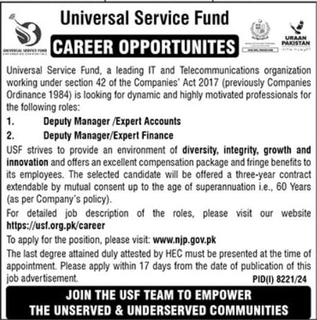 Universal Service Fund Islamabad, Islamabad Pakistan invites applications from eligible candidates for the following positions as per the job advertisement published in the daily Jang Newspaper dated 30 May 2025: